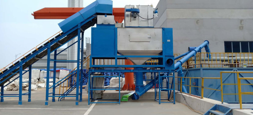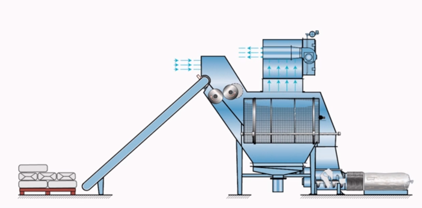 小袋自動拆包機由人工或機器人將包裝袋放到輸送機上,進行輸送到指定位置,或進入破碎機后自動拆包,物料自動分離落入下游設備。廢袋自動分離后自動壓縮,拆包的過程中產生的揚塵由過濾除塵器凈化過濾達標后排出。